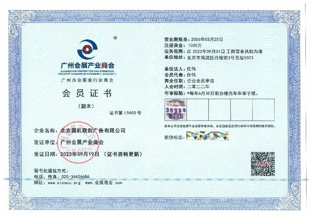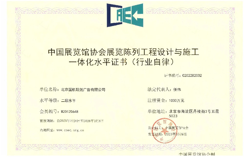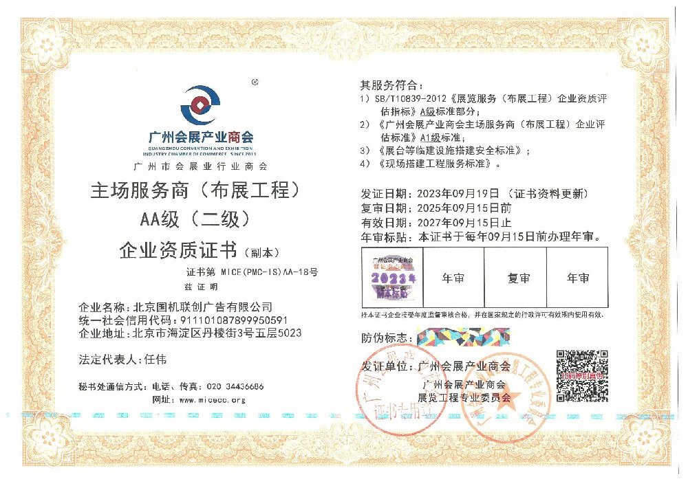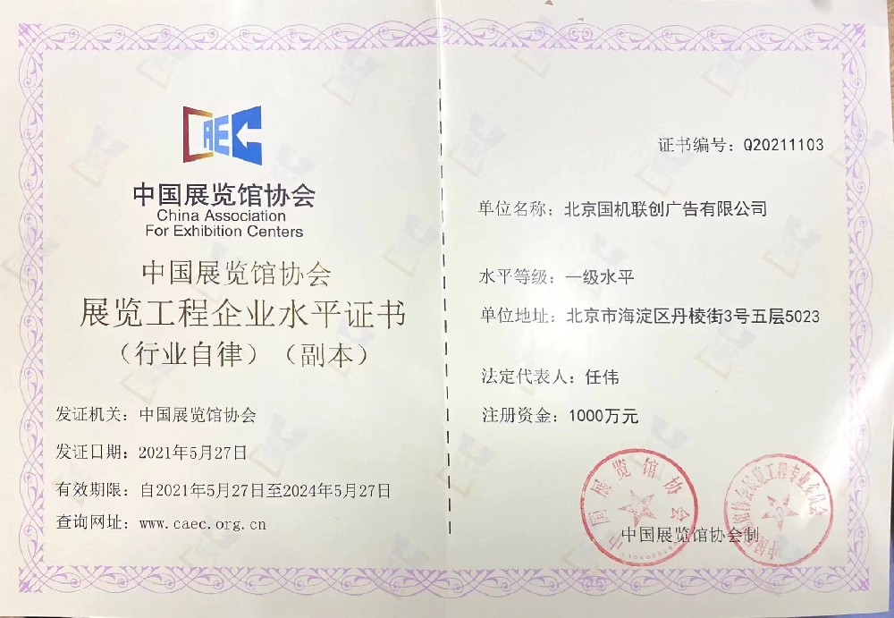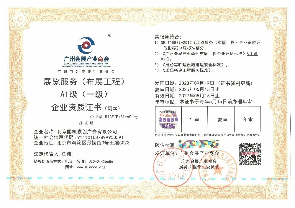 國(guó)機(jī)聯(lián)創(chuàng)擁有中國(guó)展覽館協(xié)會(huì)展覽工程企業(yè)一級(jí)資質(zhì);中國(guó)展覽館協(xié)會(huì)展覽陳列工程設(shè)計(jì)與施工一體化二級(jí)資質(zhì);展覽服務(wù)(布展工程)A2級(jí)企業(yè)資質(zhì);榮獲中國(guó)綠色會(huì)展聯(lián)盟授予的“綠色會(huì)展推廣先進(jìn)單位”稱號(hào)。